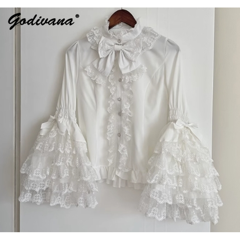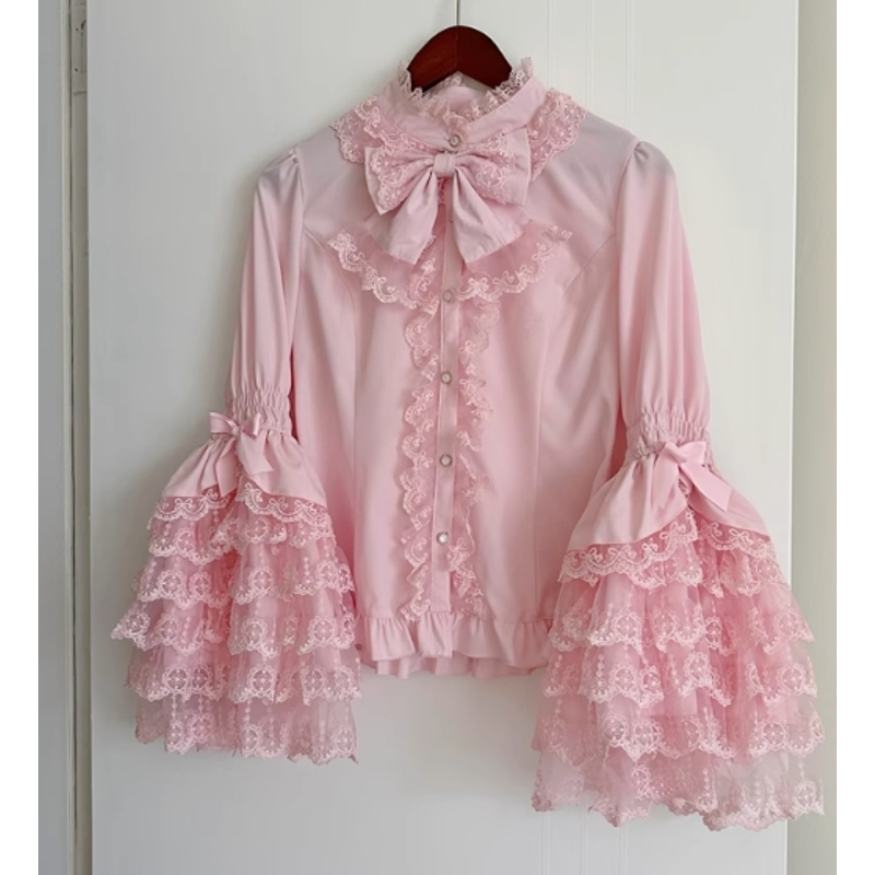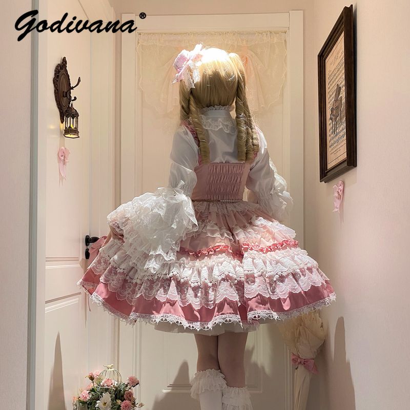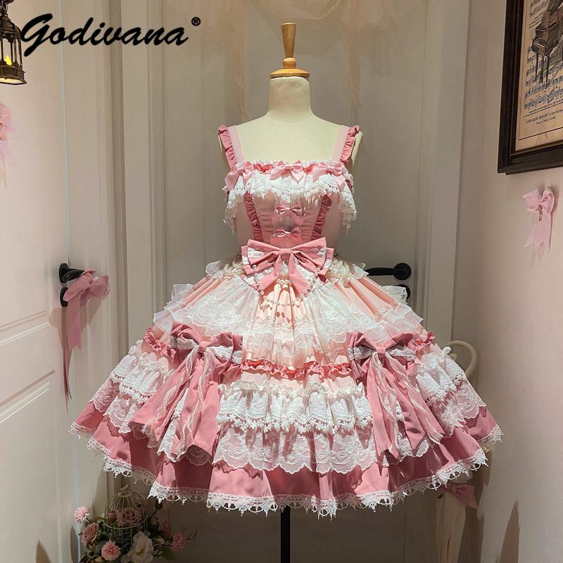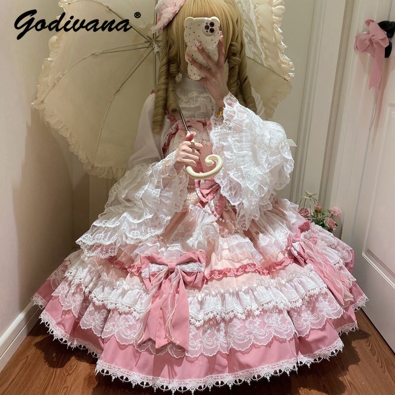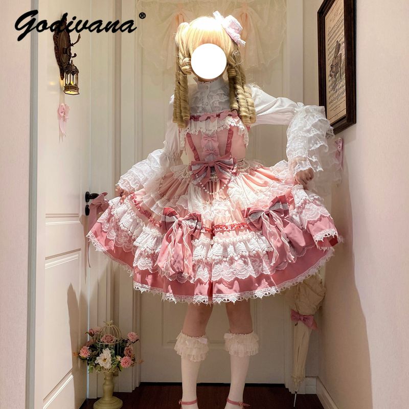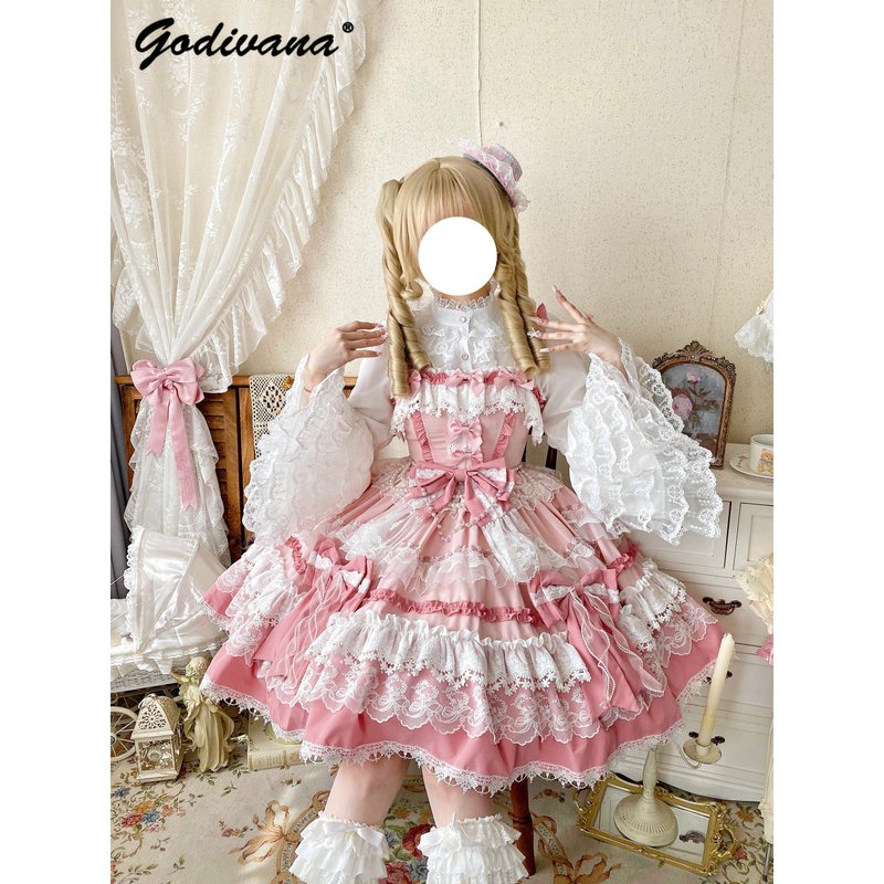 Original New Spring Sweet Pink Lace Bow Cake Dress Lolita Girl Women's Lace Ji Sleeve Shirt Princess Cos Suspender Jsk Dress