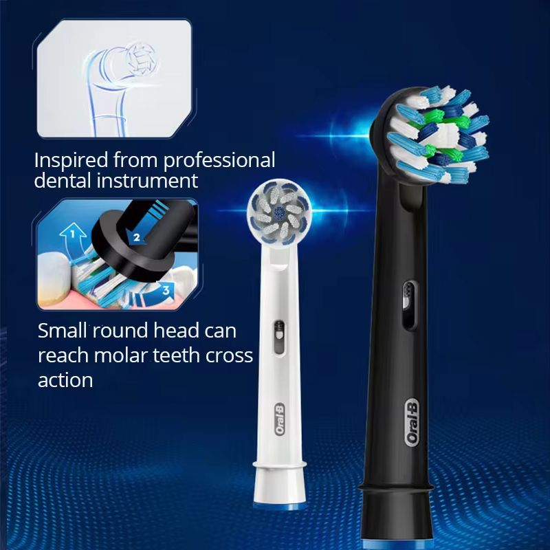 3.Compatible with Oral-B brush heads for every oral care need: CrossAction, FlossAction, Precision Clean, 3D White, Sensitive Gum Care, Deep Sweep, Dual Clean. Does not fit iO brush heads