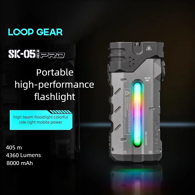 1.The LOOP GEAR SK05 Pro flashlight is a compact and powerful lighting device designed to cater to a wide range of outdoor and professional needs. Featuring an innovative dual-light source system, this flashlight combines a spotlight and a floodlight to offer unmatched versatility and performance. With a maximum output of 4360 lumens, it effectively illuminates large areas while providing a precise beam for long-distance visibility. The SK05 Pro is equipped with an 8000mAh rechargeable battery, ensuring prolonged usage and serving as a reliable power source for extended adventures or critical tasks.