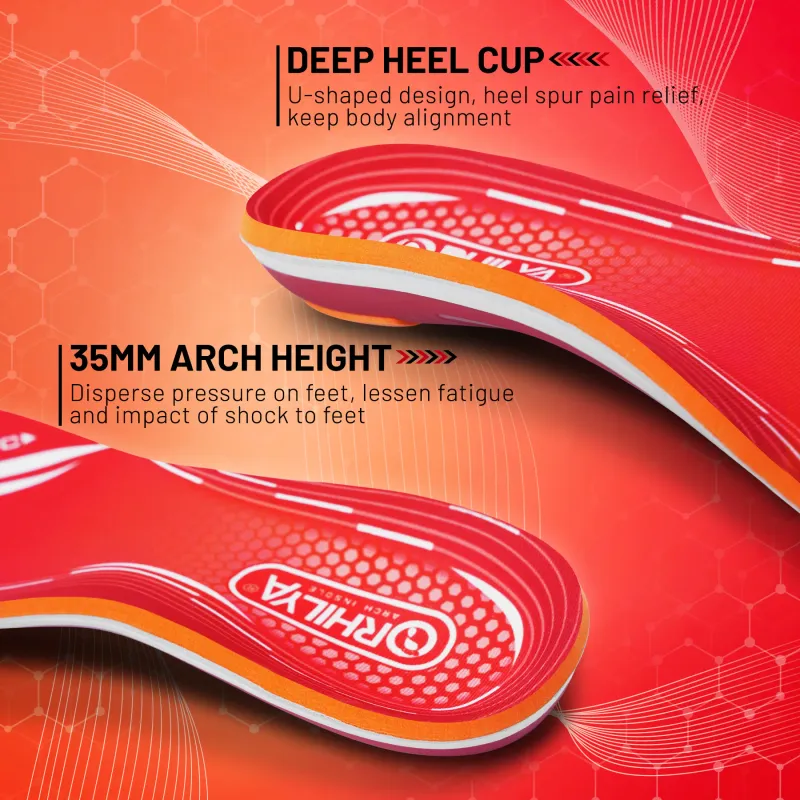 35MM arch height. Semi rigid arch support. Fit for low, neutral and high arch. Disperse more pressure on feet, lessen the impact of shock and fatigue to feet, make standing and walking more comfortable