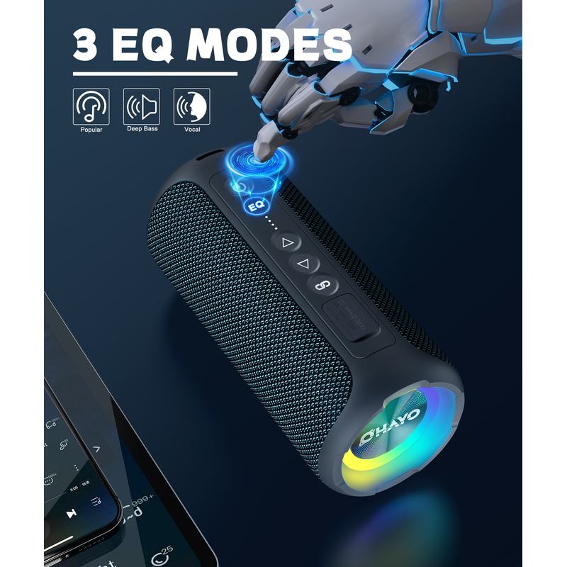 Two full-range drivers and dual passive radiators produce 40W(2 x 20W) loud stereo sound with enhanced bass, detailed mids, and crystal clear highs without distortion at any volume. Press the EQ button to freely switch among the three modes of pop, deep bass, and vocal, then you can feel the wonderful music in different equalization modes without manual adjustment.