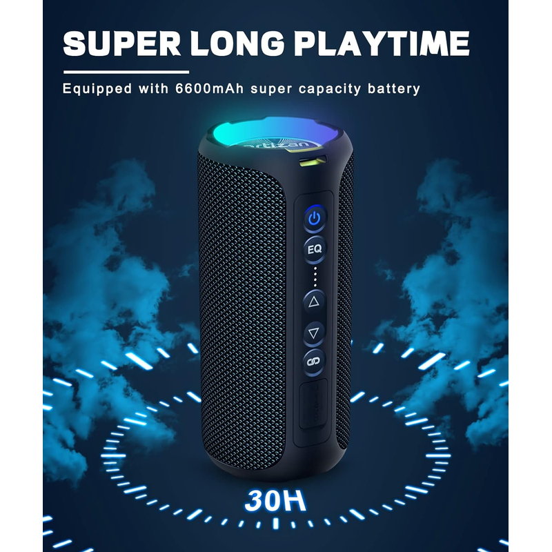 Built-in 6600mAh high-power 5C power battery, which can be charged more than 1200 times. Compared with the 300-time rechargeable battery of ordinary speakers, the working life is up to 4 times! It provides stronger and longer-lasting power while ensuring you an immersive listening experience on long outdoor trips. The power indicator light is specially designed at the button, allowing you to easily understand the power usage of the speaker.