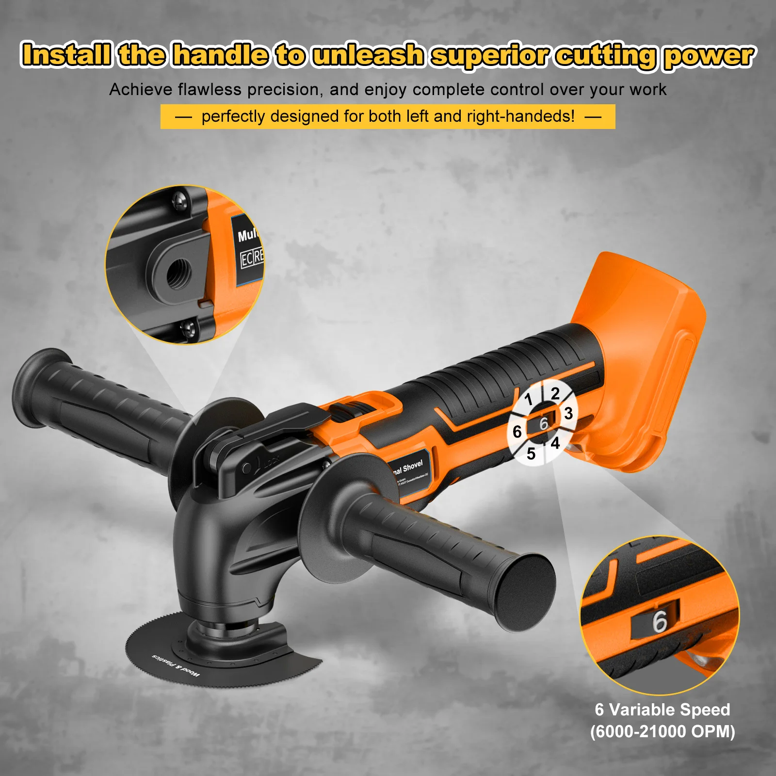 [POWERFUL MOTOR] - Our oscillating multi tool , fully adjustable tool will switch from 8500 to a whopping 21,000 OPM for a variety of applications, enabling you to tackle a wide range of DIY projects with ease and precision.Seamlessly switch between low-gear precision polishing and high-gear wood and metal cutting!