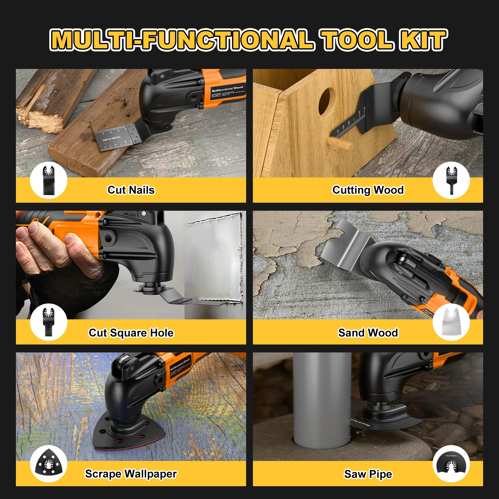 [VERSATILE APPLICATION] - Cordless oscillating multi tool is very suitable for low intensity sawing, sanding, trim, and cutting a variety of materials including skirting boards, copper, and plastic pipes, soft non-ferrous metals, plasterboard, laminates, and carpets ect.