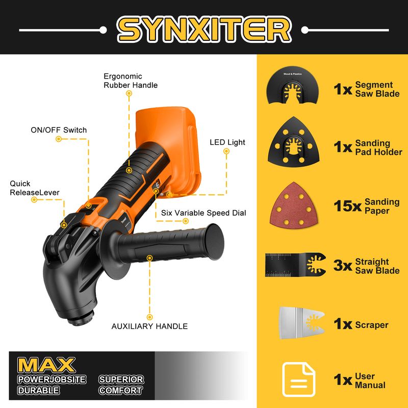 [DURABILITY & HANDLING] -Multi-tool is designed for durability and enhanced handling.The all-metal gear case resists common impacts on the job, extending its lifespan,while the rubberized mold covering the handle ensures a firm grip, even in slippery conditions, for improved control and comfort during use.