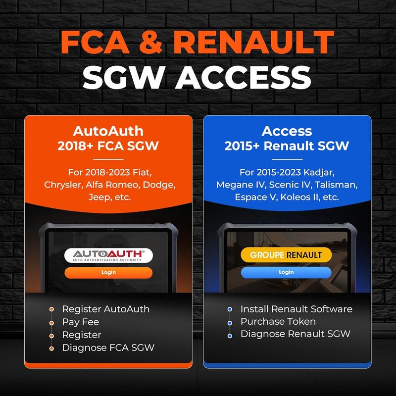11. FCA SGW Vehicle Access & Renault Security Gateway Function: Allow you to secure visit FCA vehicles (for Fiat, Chrysler, Dodge, and Alfa Romeo 2017 later) & Renault models (Renault software needs to upgrade to V2.0 version) and skip the gateway limitation. (NOTE: it need to pay extra 200usd to buy FCA)
