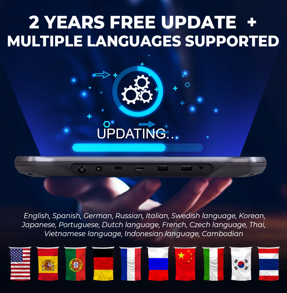A4: It supports multiple languages including English, Spanish, German, Russian, Italian, Swedish language, Korean, Japanese, Portuguese, Dutch language, French, Czech language, Thai, Vietnamese language, Indonesian language, Cambodian. Please send serial number to us, we will help you authorize language.