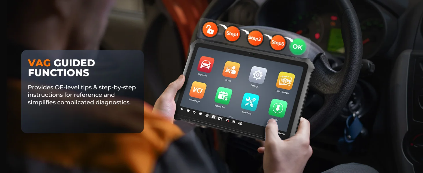 5. VAG Guided Functions: Provide onscreen operation instruction for complex ECU coding, component matching and calibration.