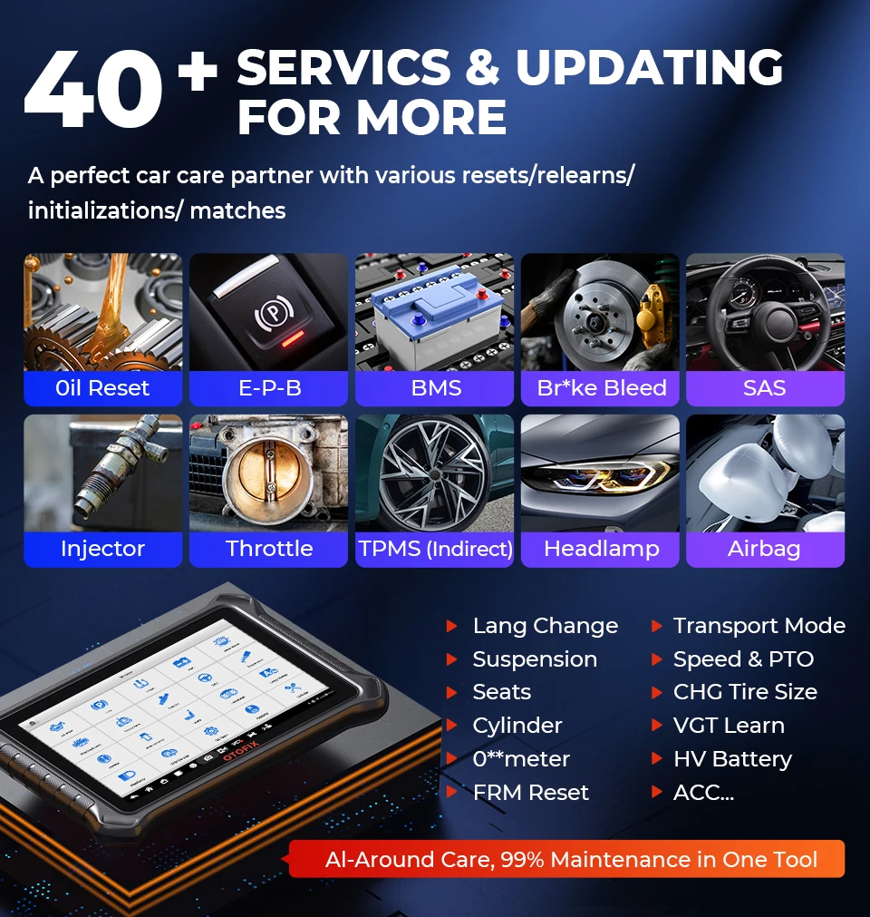 Oil Reset EPB Reset, SAS Reset, Airbag Reset, BMS Reset, Brake Bleed, TPMS Reset, DPF Regeneration, IMMO, Clutch, Trans Adaption, WIN DR ROOF, Headlamp, TEC Learn, A/F Setting, Injector Coding, Suspension Calibration, Throttle Adaption, ABS/SRS, Gear Learning, Sunroof Initialization, Seats Calibration, Language Change, Headlamp, CHG Tire Size, Cylinder, Turbocharging, Limit, Trans Adaption, VIN, ACC, HV Battery, Transport Mode, A/C, Rain/Light Sensor, and More.