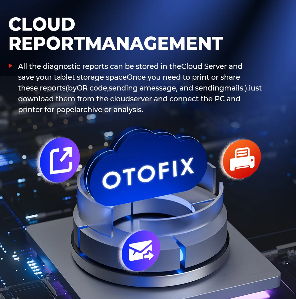 All the diagnostic reports can be stored in the Cloud Server and save your tablet storage space. Once you need to print or share these reports (by QR code, sending a message, and sending mails.), just download them from the cloud server and connect the PC and printer for paper archive or analysis.