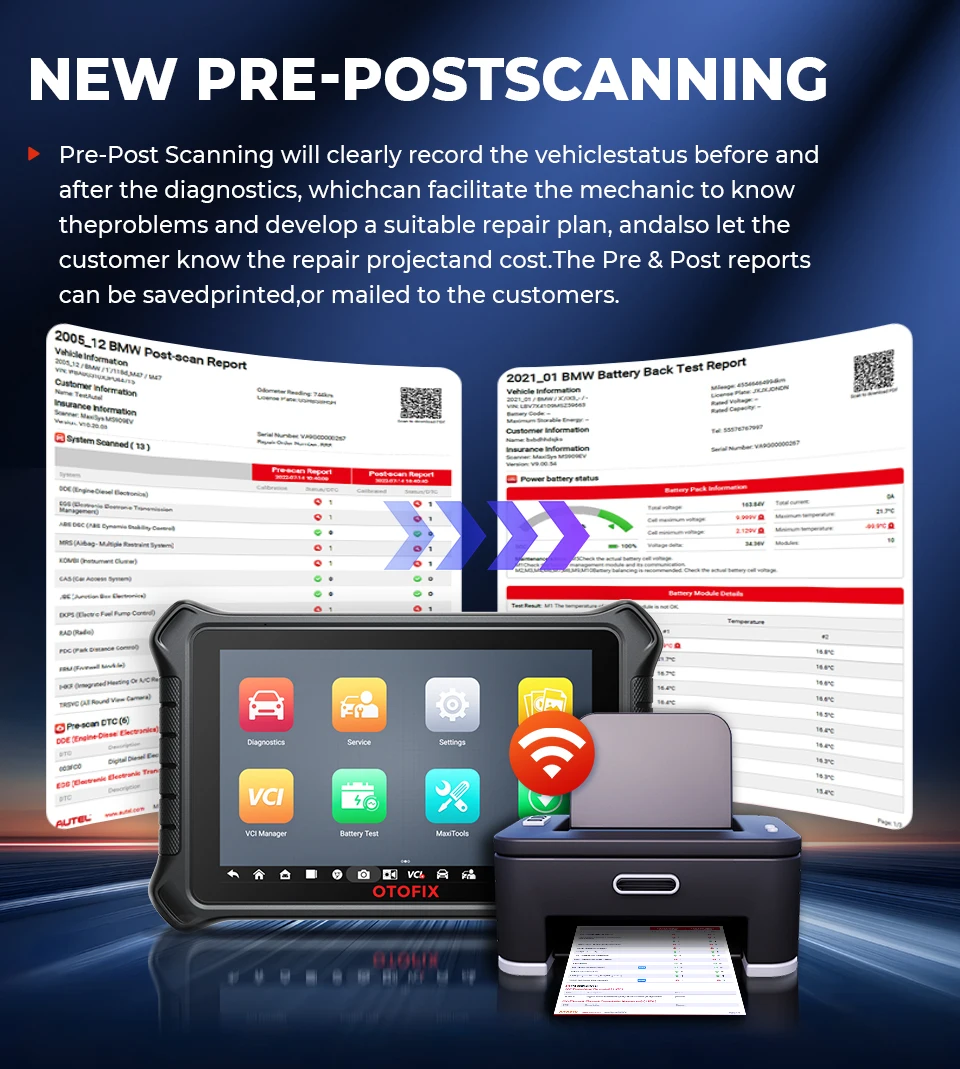 Pro-Post Scanning will clearly record the vehicle status before and after the diagnostics, which can facilitate the mechanic to know the problems and develop a suitable repair plan, and also let the customer know the repair project and cost. The Pre & Post reports can be saved, printed, or mailed to the customers.