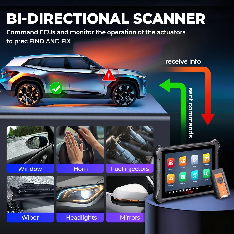 7. Bi-directional Control: For quick problems location, you can widely apply OTOFIX scanner para autos to vehicle doors, windows, sunroof, wipers, headlights, radiator fans, etc.