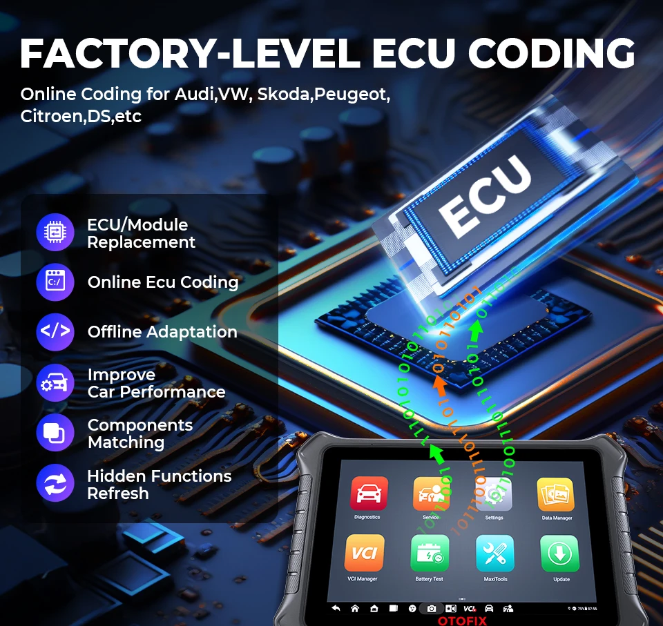 No need for manually input code, OTOFIX D1 PROS escaner automotriz professional can connect to the online server to automatically get/reprogram the code after replacing a new ECU module. Compatible with VW, Skoda, Peugeot, Citroen, DS, etc.