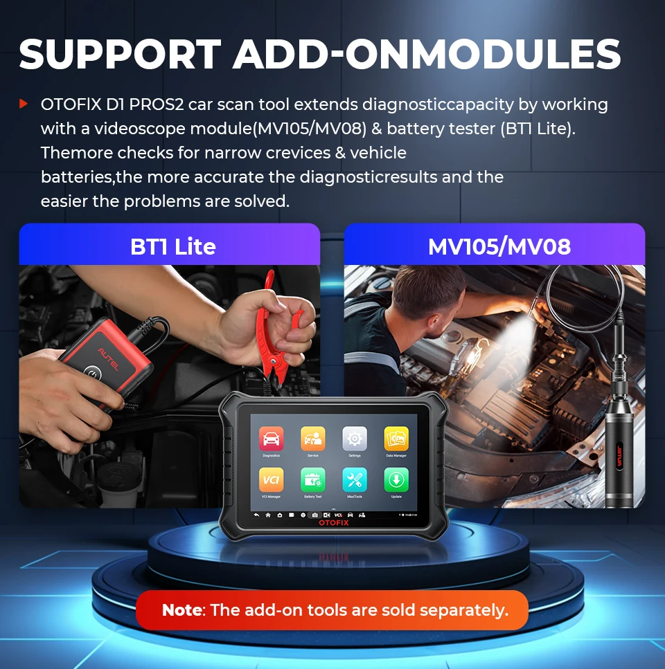 OTOFIX D1 PROS car scan tool extends diagnostic capacity by working with a videoscope module (MV105/MV108) & battery tester (BT1 Lite). The more checks for narrow crevices & vehicle batteries, the more accurate the diagnostic results and the easier the problems are solved. Note: The add-on tools are sold separately.
