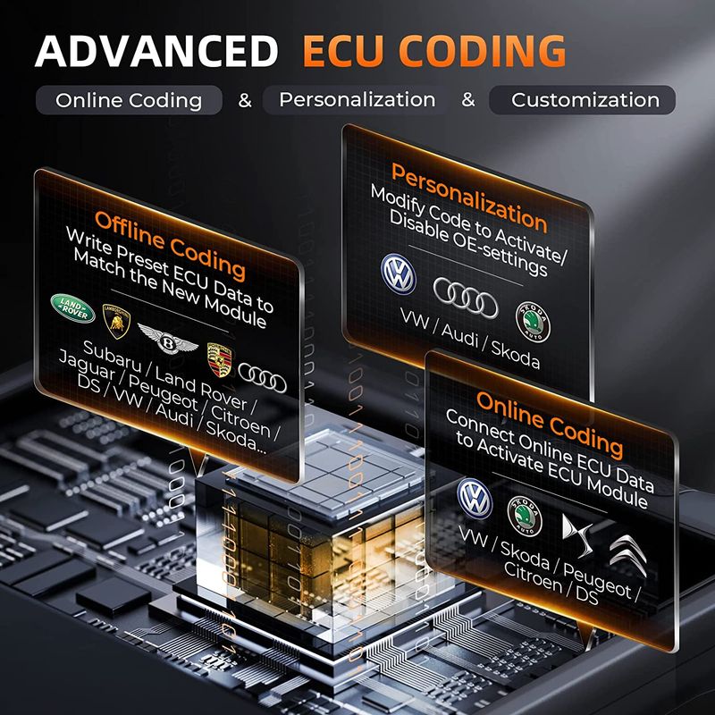 2. ECU Coding: Help to match the car with component control modules after replacing new ECUs. Online Coding for VW/Skoda/Peugeot/Citroen + Personalization for VW/Au-di/Skoda + Offline Coding for 25 models.