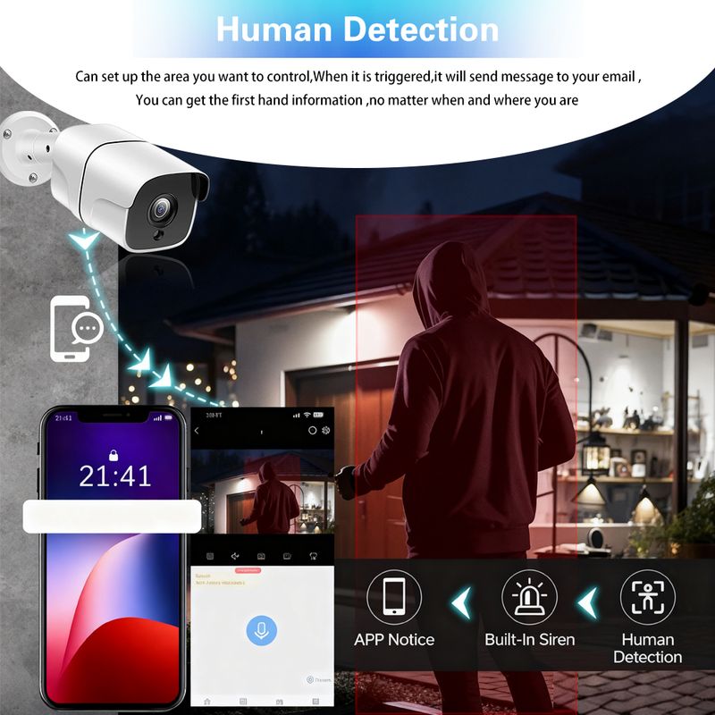 If the camera detects humanoid movements, the system will send out an alarm (Show message to APP, Send email). You can know that someone is approaching your home anytime, anywhere.