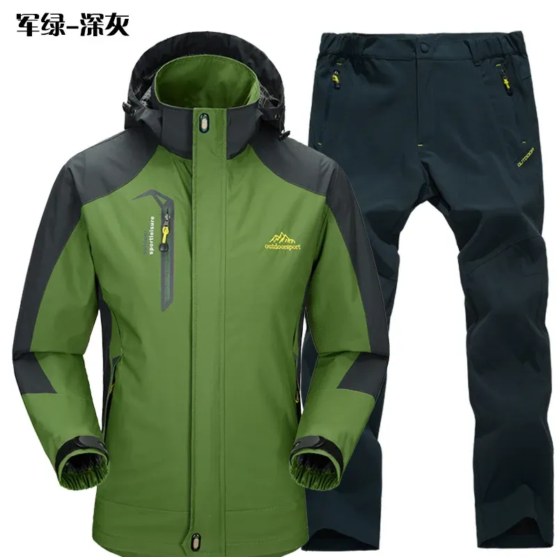 Outdoor Jacket Pants Sets Men Fleece Thermal Waterproof Windproof Hooded Jackets Hiking Military Trip Mountain Camping Clothes