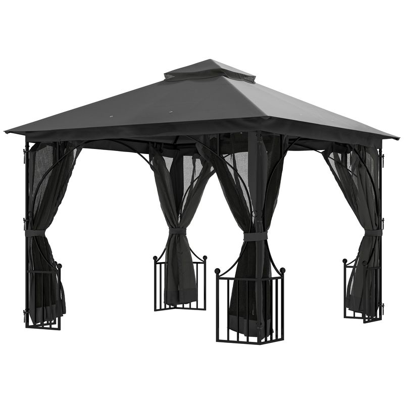 Bring life back to your outdoor living space with this hot tub gazebo with sides from Outsunny. The steel frame gazebo offers optimum protection against harmful UV sunlight and rain. The slim lines and edge design ensures great usage, while the included ground stakes offer added stability. The powder coated rust-resistant metal frame is designed to last for years of usage. The double tiers on the top offer better ventilation.