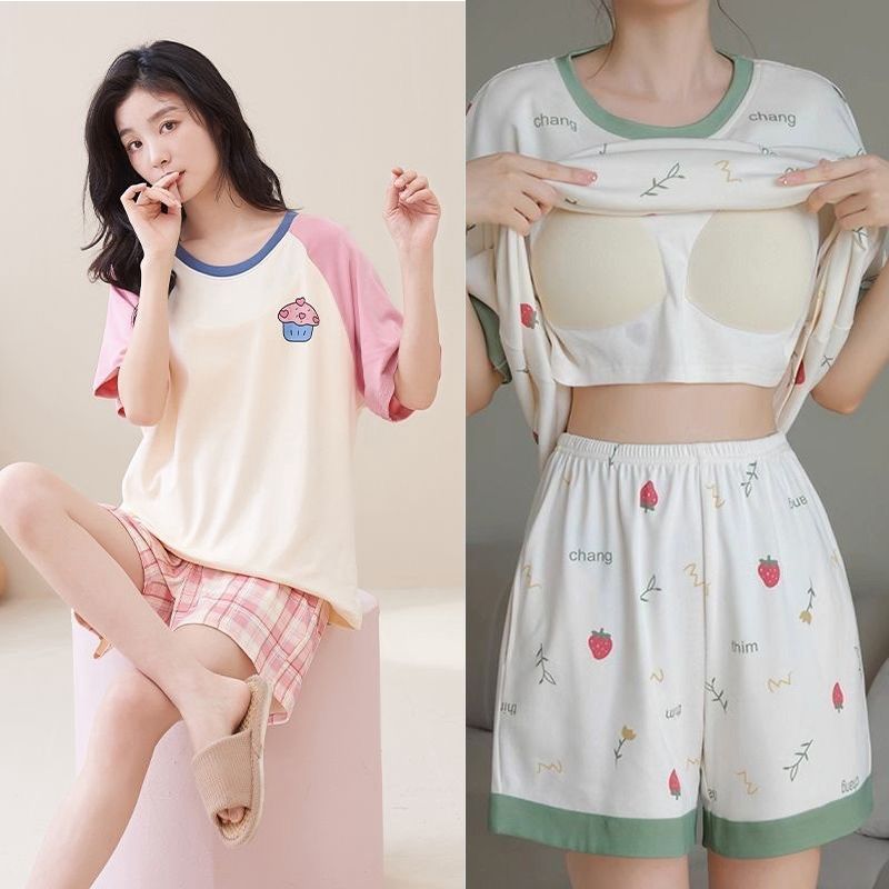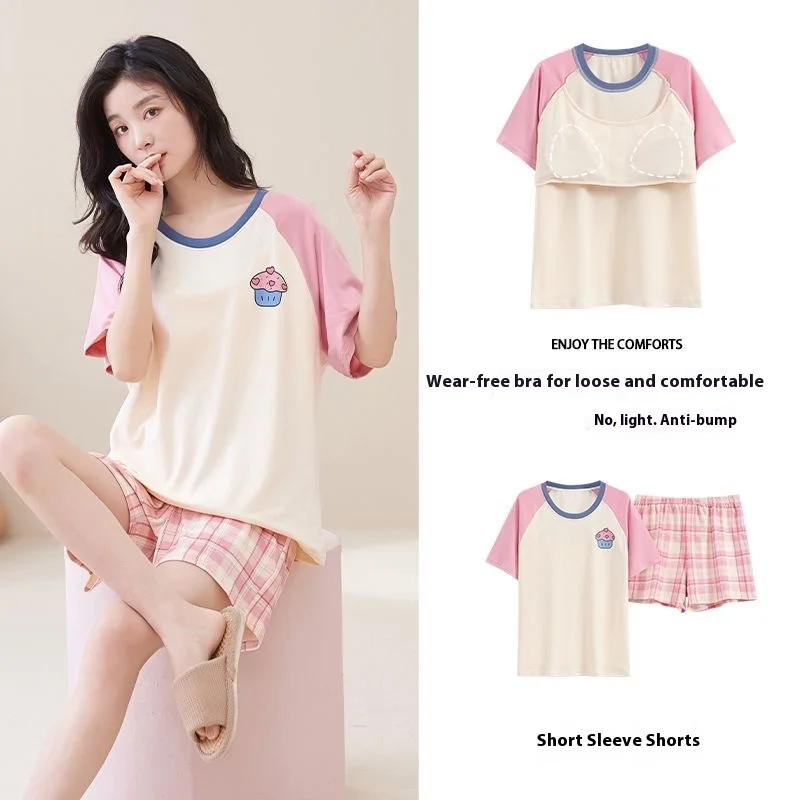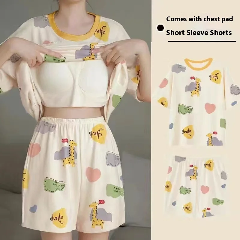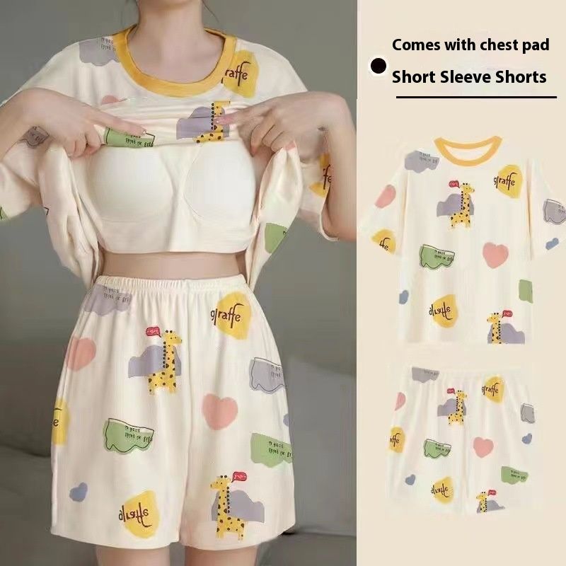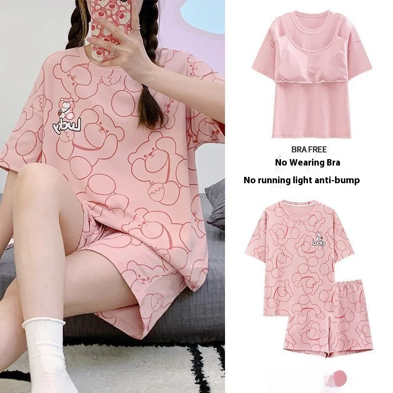 Pajamas Female Summer Short-Sleeved Set of Sweet with Chest Cushion Korean Version of the Cartoon Students Homewear Sleepwear
