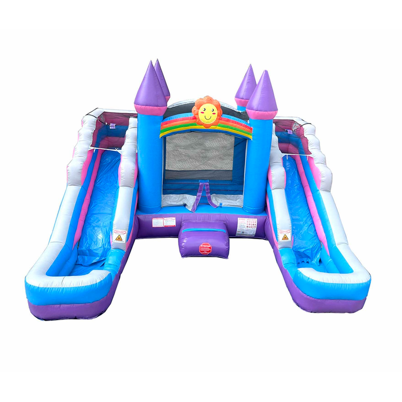 1. TROPICAL BOUNCE HOUSE w/DUAL SLIDES: Our crossover tropical combo inflatable bounce house has a modest size 9' x 7' bounce area and 2 slides for double the fun! The slides can be used dry or wet if you want an inflatable water slide. Our outdoor toys are ideal for encouraging outside play and exercise.