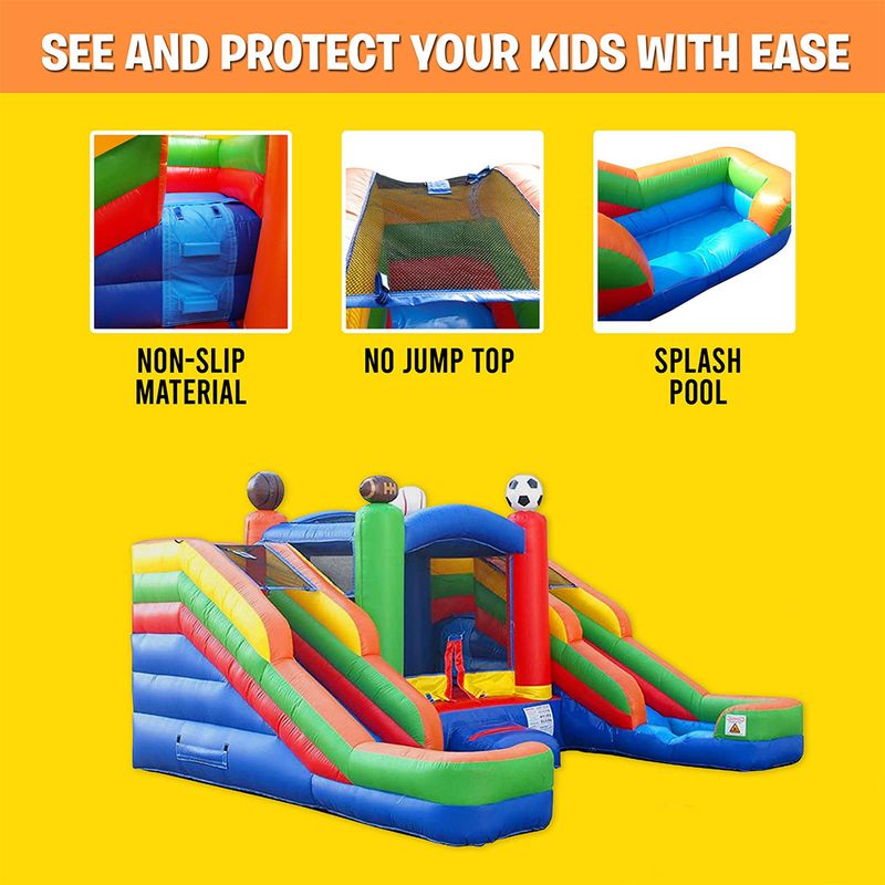 3. 500 LB WEIGHT CAPACITY: Our quick-inflating jump house for kids has a bounce area that can fit up to 4 jumpers and a maximum weight capacity of 500 pounds. Plus, it inflates in just 2 minutes. The dimensions of the whole unit including the bounce house and blow up water slides for backyard are 16.5' Length x 15' Width x 11' Height. Ideal for summer, a kid’s birthday party, pool party, or for commercial use!