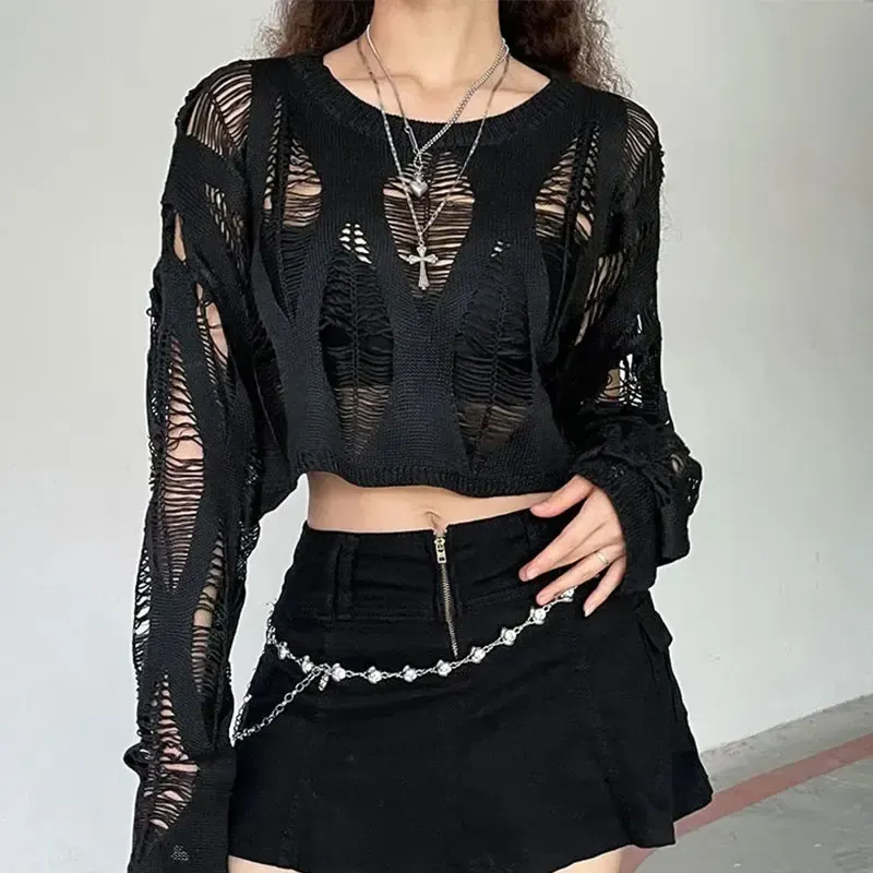 Perforated Hollow Out Knitted Blouse Sunscreen Long Sleeve Top Gothic Dark Black Sexy Thin Sweater Women's Summer Chic Crop Tops