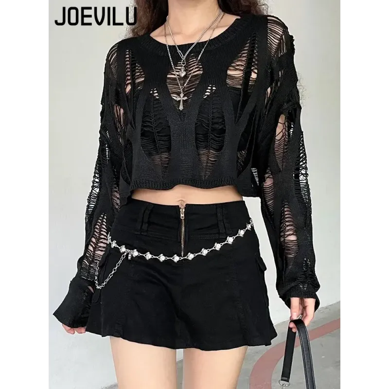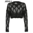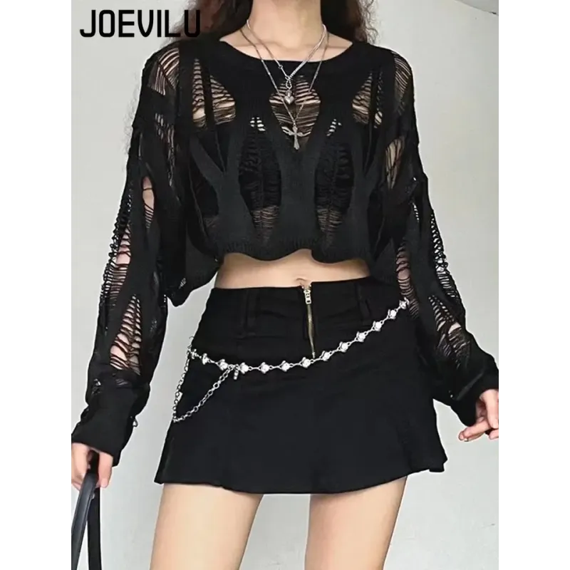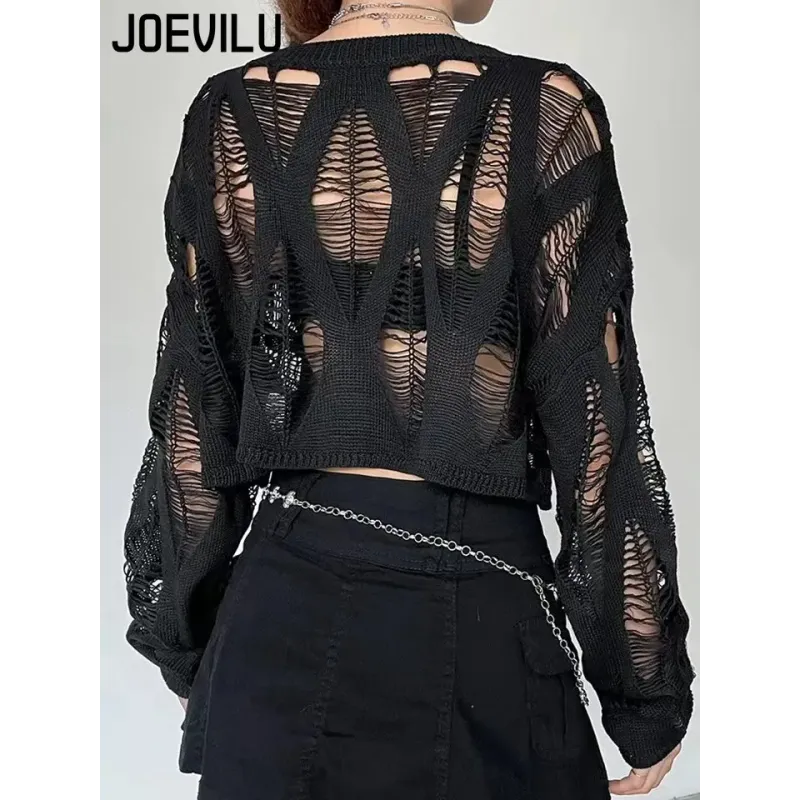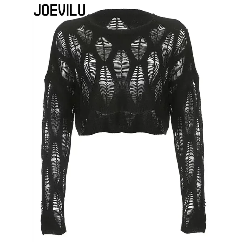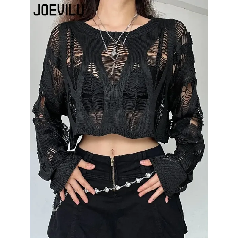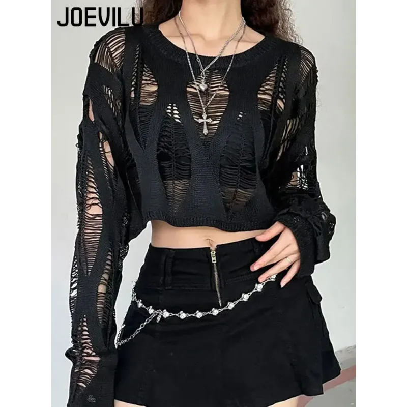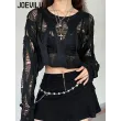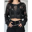 Perforated Hollow Out Knitted Blouse Sunscreen Long Sleeve Top Gothic Dark Black Sexy Thin Sweater Women's Summer Chic Crop Tops