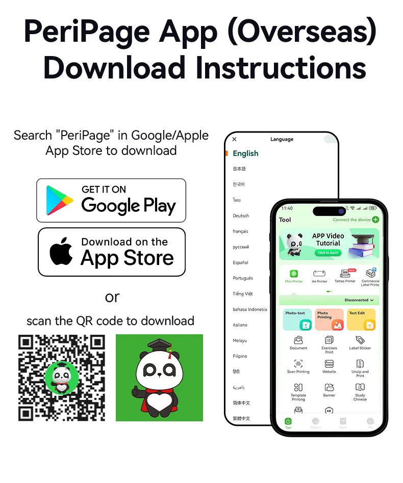 Note: Before using this product, be sure to search for "PeriPage" in the APP store to download the APP, and it can only be printed and used by connecting the machine through the APP. You can also download the "PeriPage" APP by scanning the QR code in the instruction manual with your mobile phone.