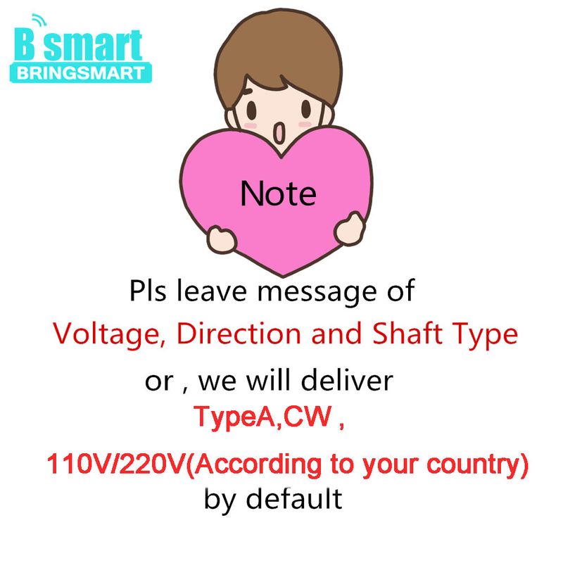 Please leave a message to tell us your choice ofvoltage,direction of rotation(CW / CCW;CW;CCWthree type) and the type of shaft (Type A;Type B;Type C;Type D)