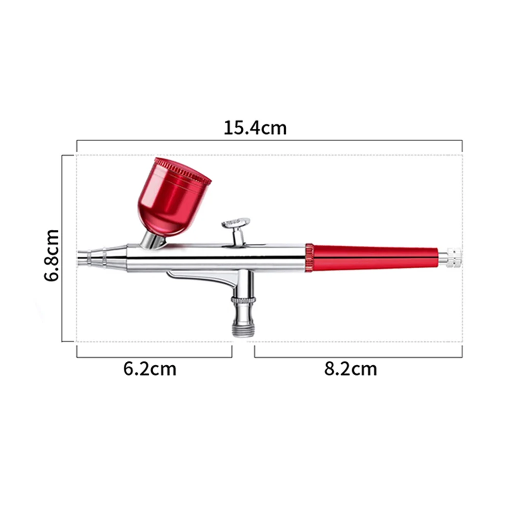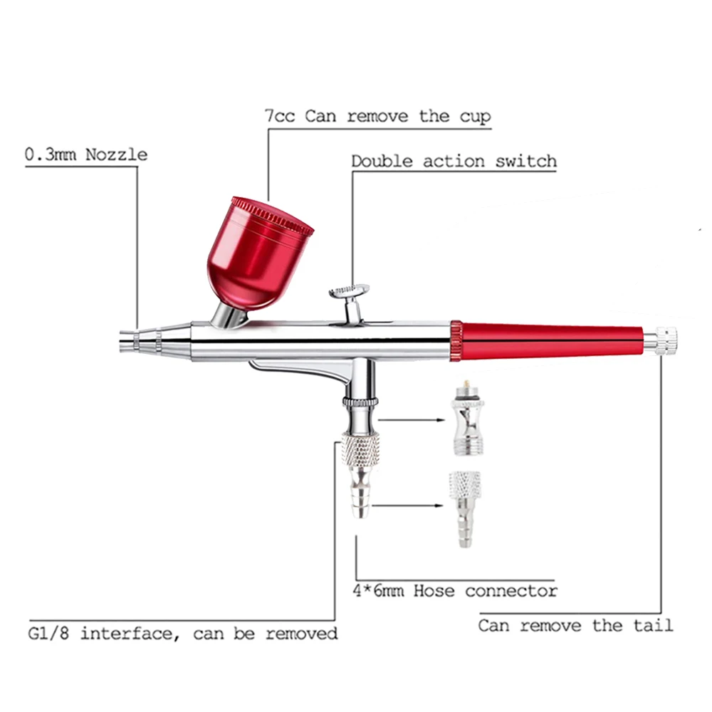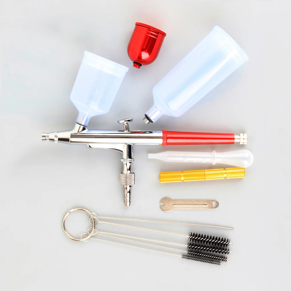 Compared with dual action airbrush,this compact mini airbrush compressor comes with a double-action airbrush.The double-action airbrush kit controls the air volume and the amount of paint at the same time which allows changing the width of the line,the range of value,and the opacity of paint without stopping,that makes your works more professional.