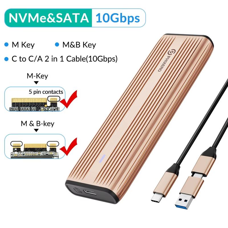 Support M Key(NVMe Protocol) / M&B Key (both NVME and SATA Protocol) SSD, not compatible with B Key SSD, with 30cm C to C/A 2-in-1 date Cable.