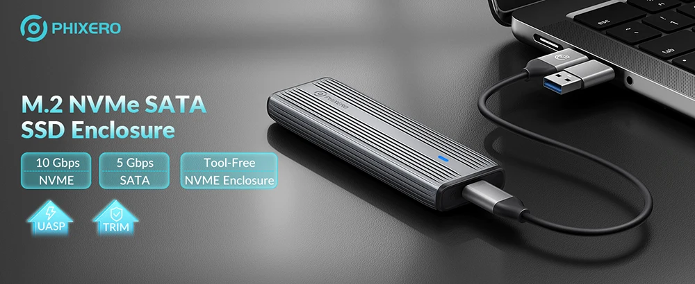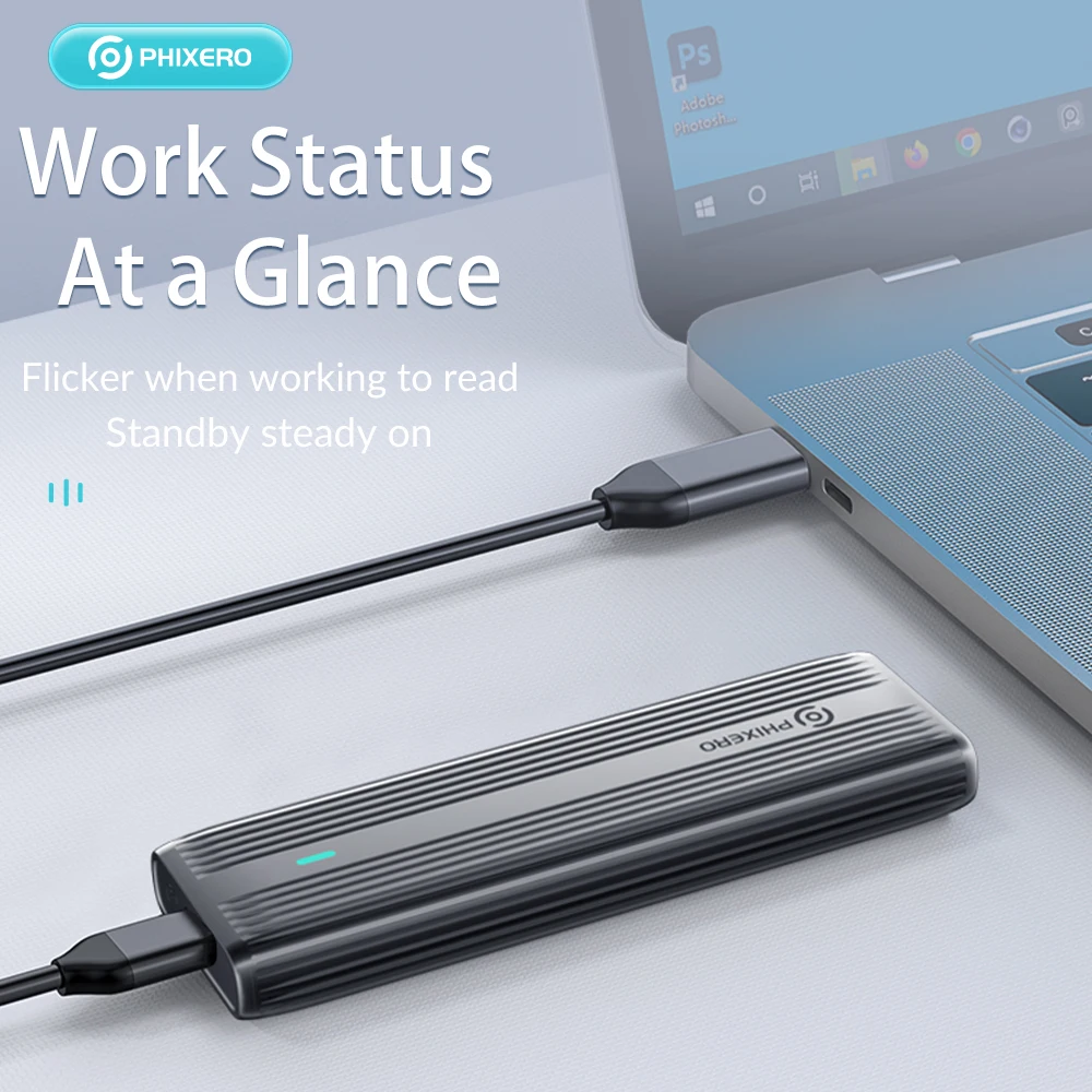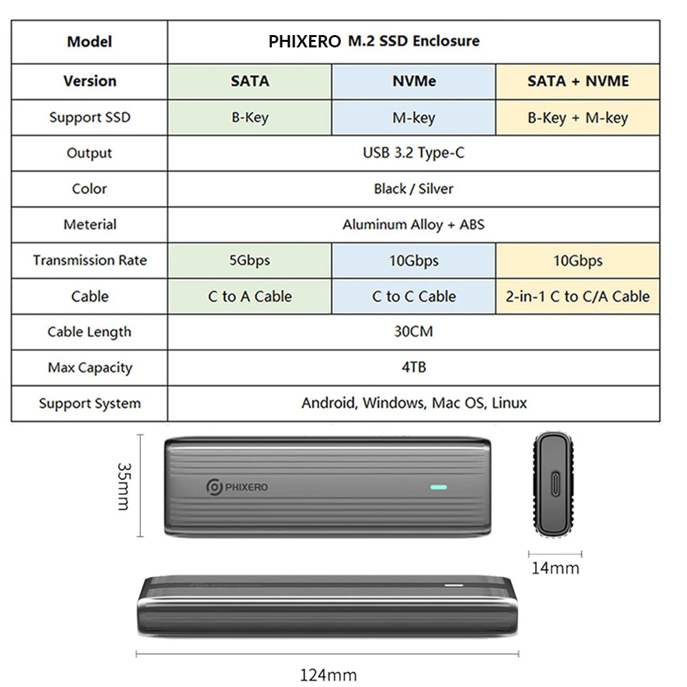 Support M Key(NVMe Protocol) / M&B Key (both NVME and SATA Protocol) SSD, not compatible with B Key SSD, with 30cm C to C/A 2-in-1 date Cable.