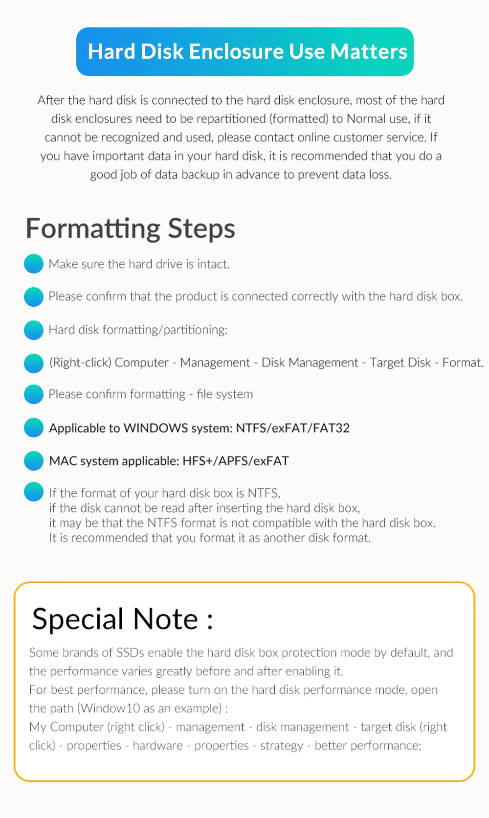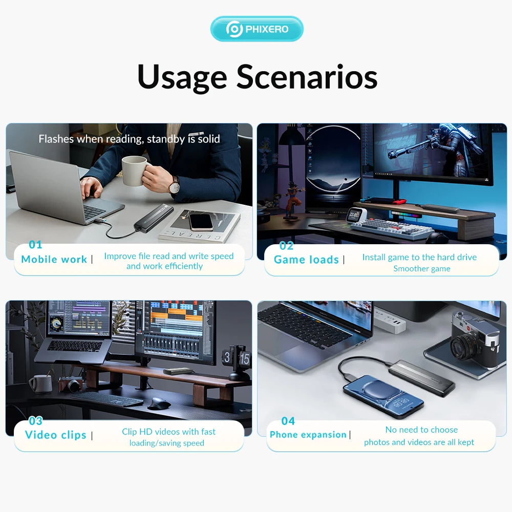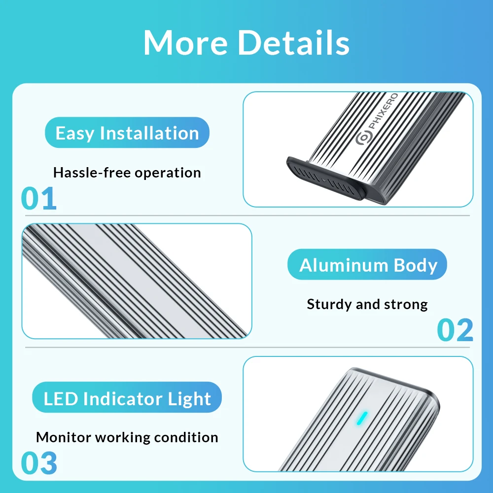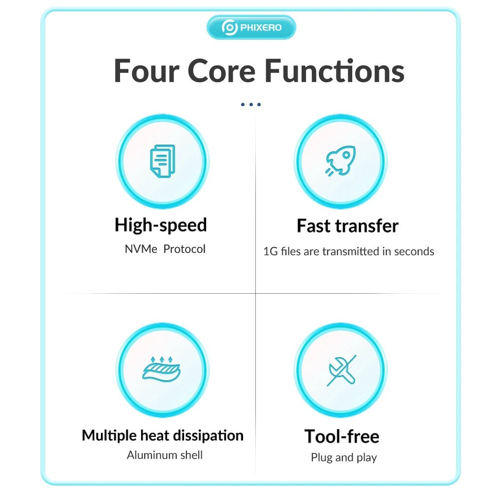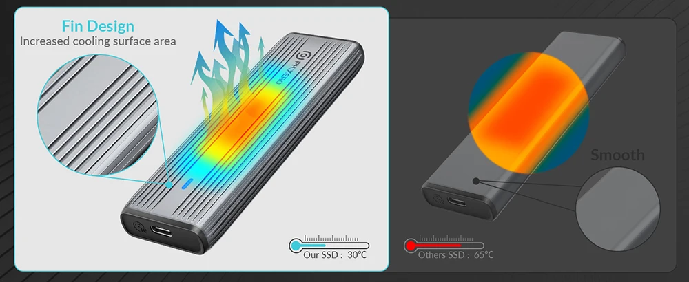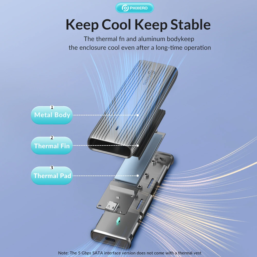 1. Heat Dissipation: Built-in Metal cooling vest + silicone thermal pad, heat dissipation is fast, and the heat dissipation efficiency is 20%-30% higher than that of ordinary ssd enclosures. PS: SATA 5Gbps Model is not included cooling vest and thermal pad.
