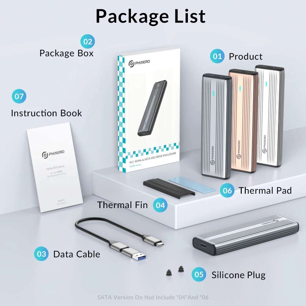 Only support NGFF SATA protocol B key/M&B Key SSD, with 30cm type-c to USB 3.0 cable. Not included cooling vest and thermal pad.