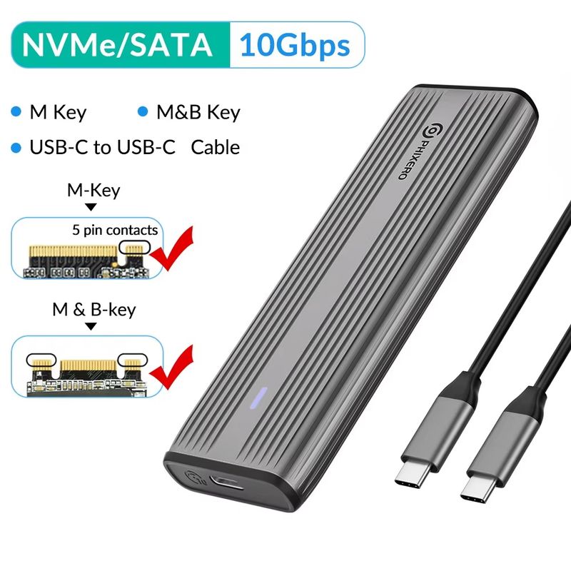 Support M Key(NVMe Protocol) / M&B Key (both NVME and SATA Protocol) SSD, not compatible with B Key SSD, with 30cm C to C/A 2-in-1 date Cable.