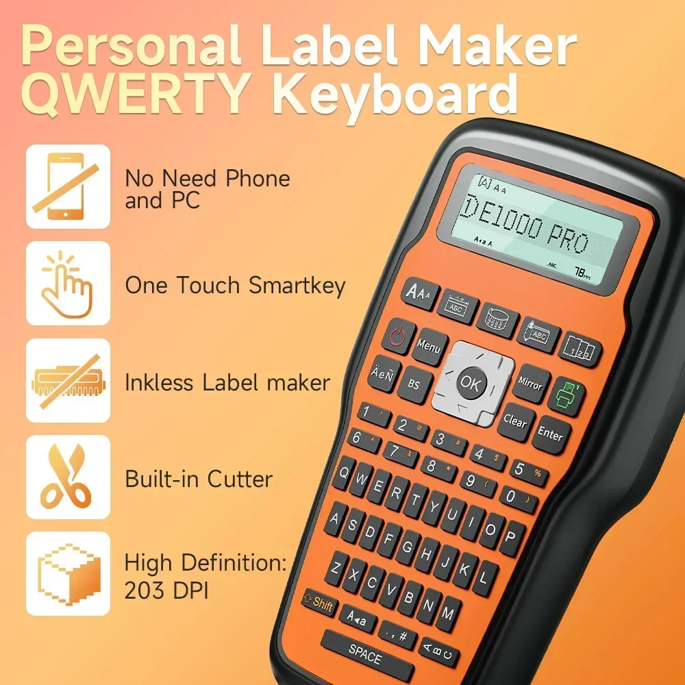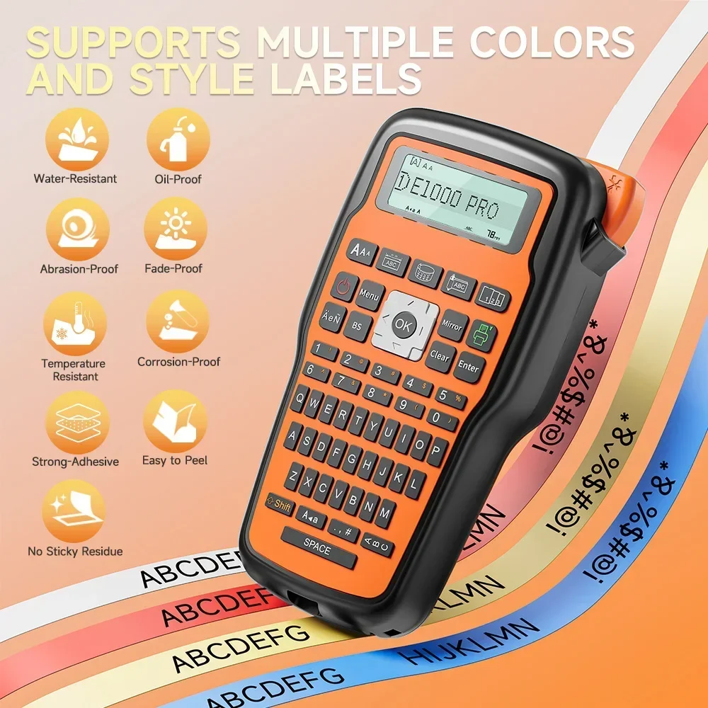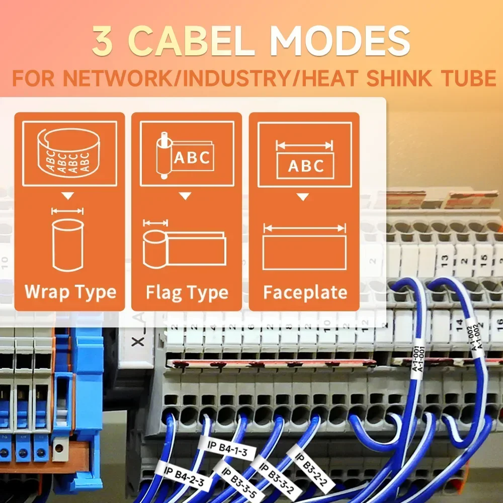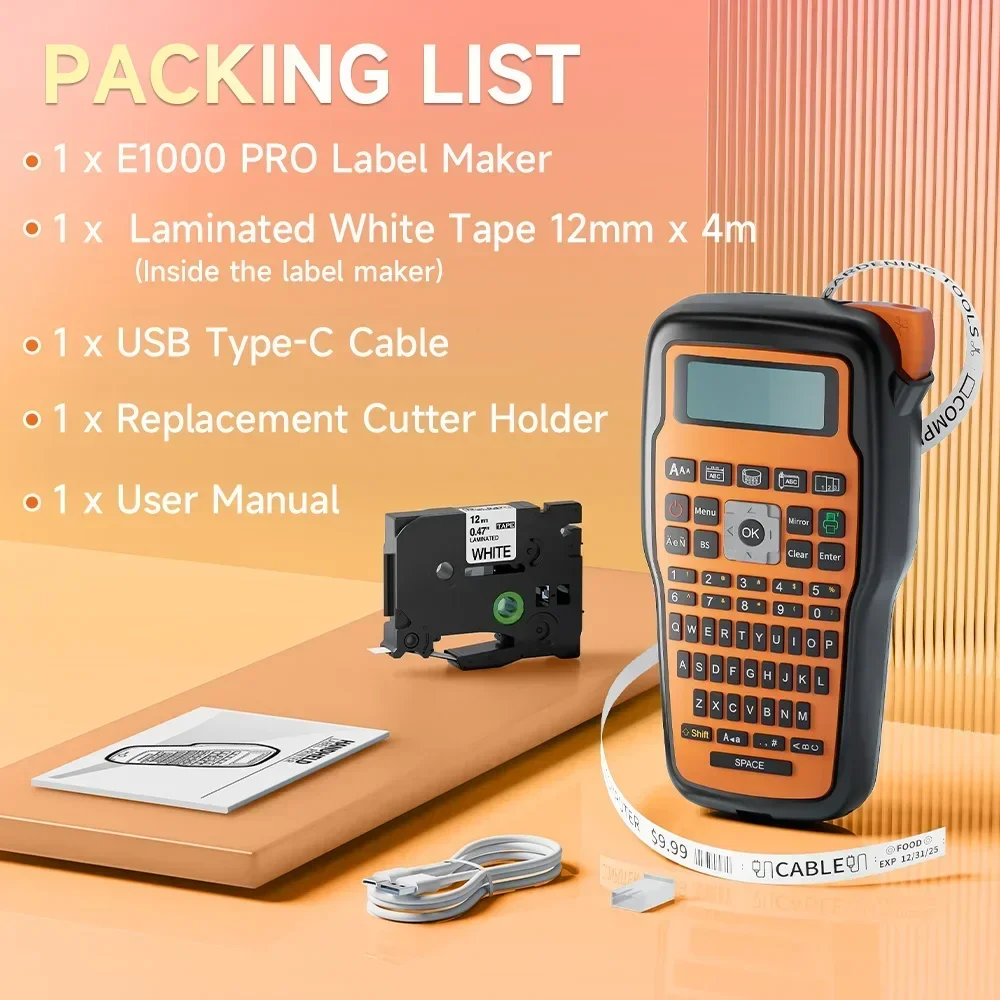 3, Work with various labels: The E1000 label maker machine compatible with Brother P-Touch TZe label tapes and industrial labels 6mm, 9mm, 12mm in a variety of materials and colors, like laminated/cabel/heat-shrink tubes/ribbon/security/PET/cloth, etc.