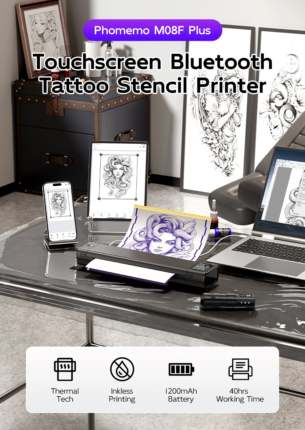 Universal Device Compatibility: Phomemo M08F Plus stencil maker connects to smartphones and tablets via Bluetooth, while supporting laptops and desktops through USB. Compatible with Android, iOS, Windows, macOS and ChromeOS systems. Designed specifically for tattoo artists and beginners, it is easy to use and allows you to focus on your creation