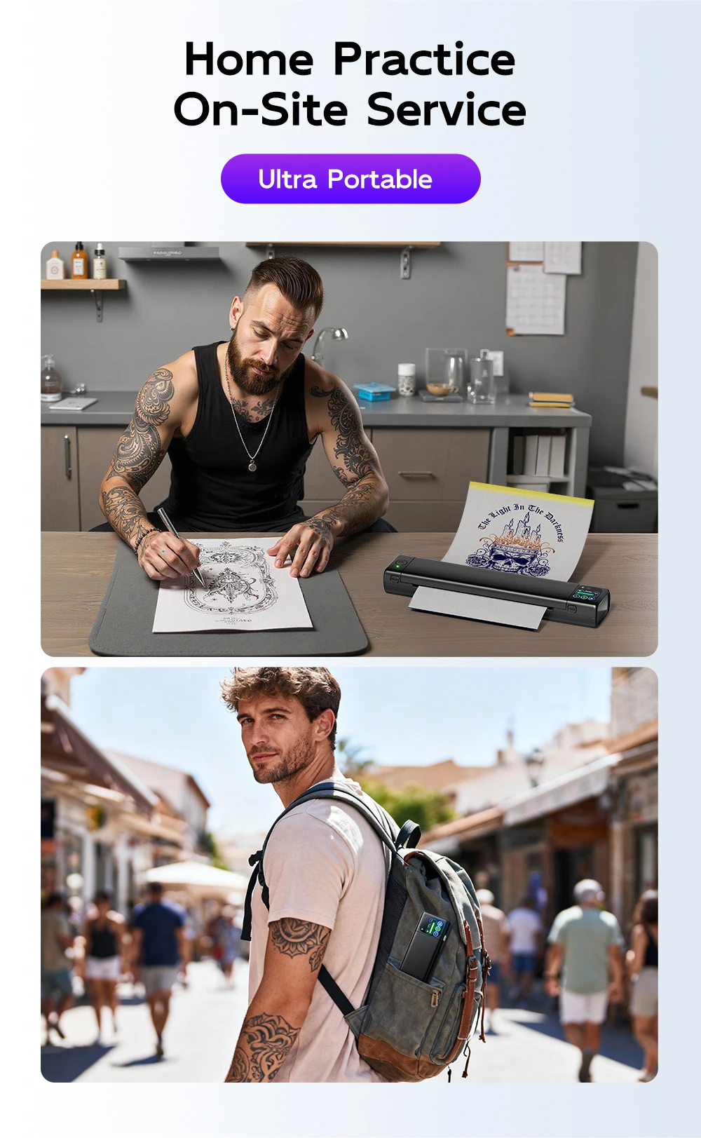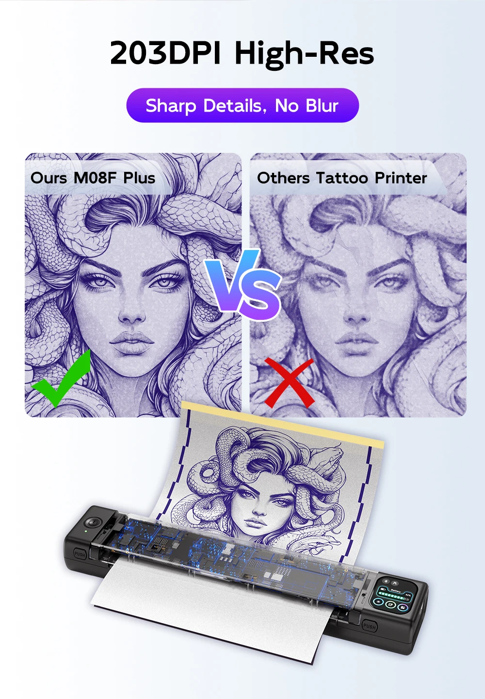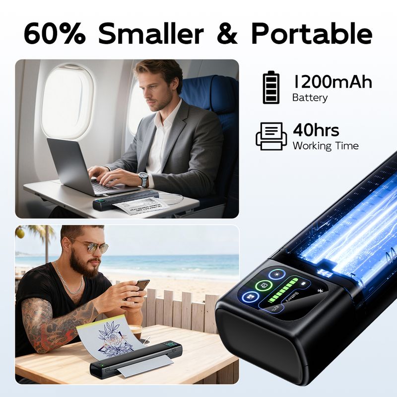 Portable & Lightweight: M08F Plus tattoo thermal printer is 60% smaller than traditional tattoo stencil machines—slips effortlessly into any bag (Specifications: 12.2"x2.6"x1.6", 1.6lb). The large-capacity battery delivers 140 pages per charge. This stencil printer for tattooing is a must have tattoo supply for artists and beginners, supporting both permanent and temporary tattoos