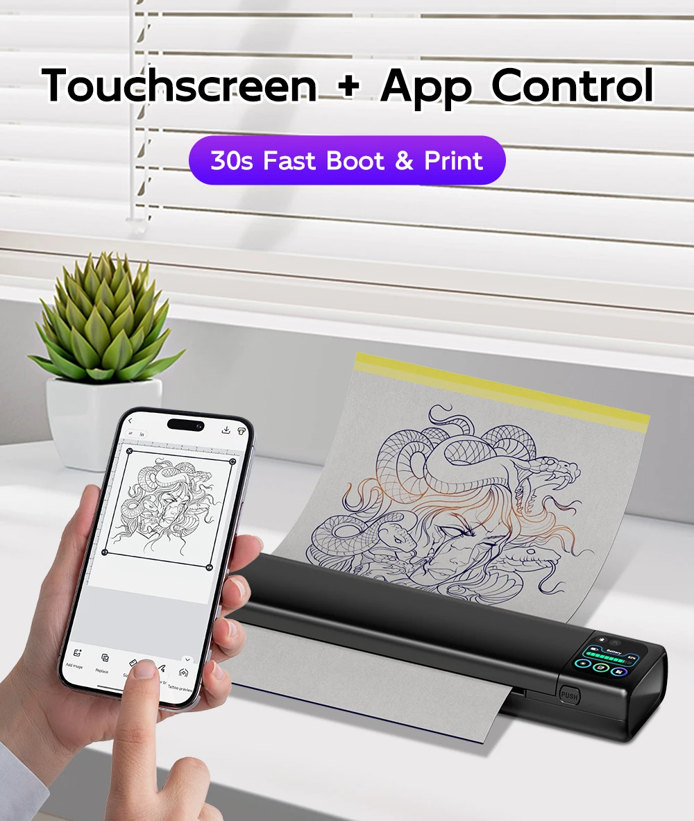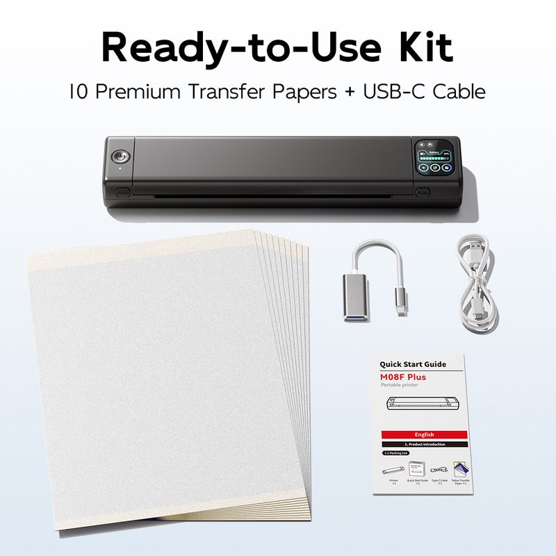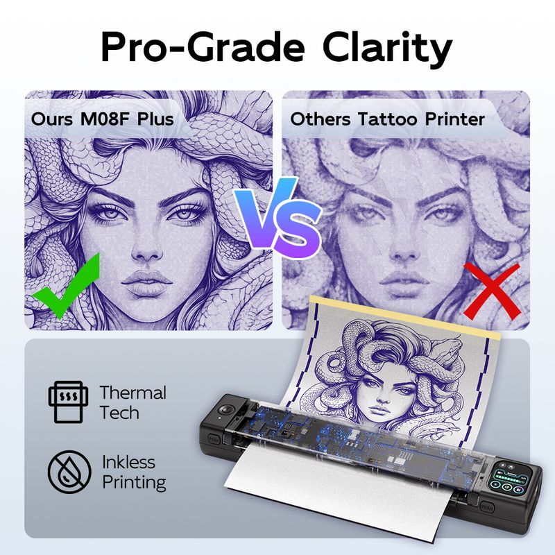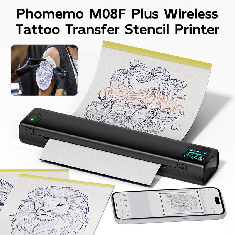 Professional-Grade Clarity: M08F Plus Bluetooth tattoo stencil printer delivers razor-sharp designs with upgraded firmware for precise details. M08F Plus inkless tattoo printer utilizes thermal technology and does not require ink. This tattoo transfer printer kit includes 10 upgraded tattoo transfer papers to help you get started