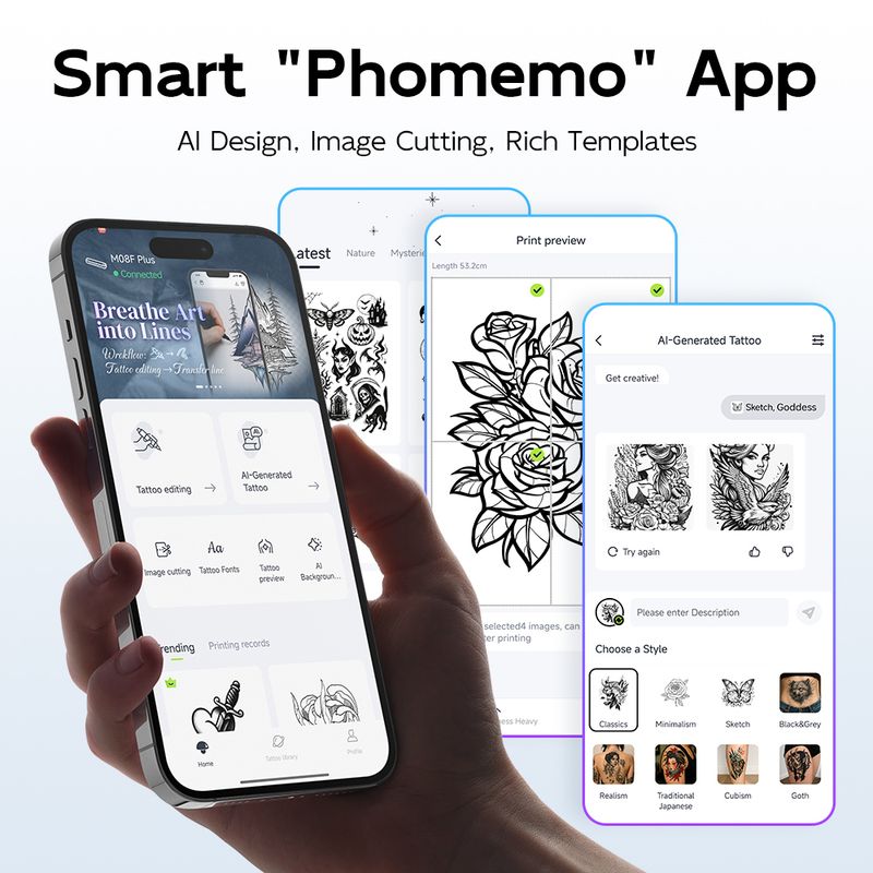 Smart App: M08F Plus transfer paper printer is equipped with a smart APP - "Phomemo". Including diverse editing tools like large image cutting, tattoo preview, transfer line, anti-wrinkle mode, AI image generation and AI background removal. Access a rich tattoo image library and various font styles to meet different design needs. (Attention: Some tattoo stencil materials and AI functions require a subscription to unlock)