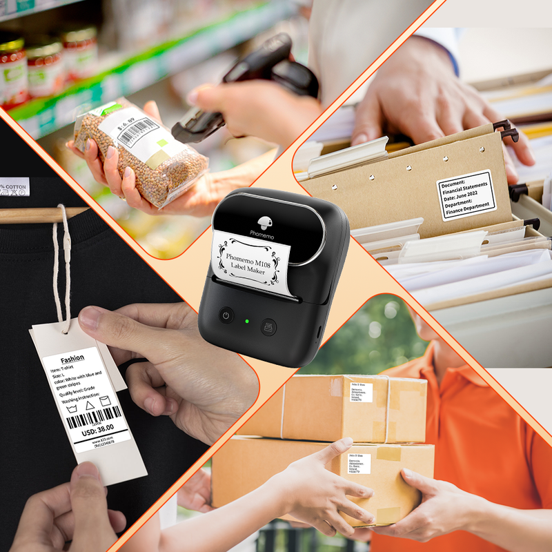 InklessThermal Label Printer-M108 barcode label printer utilizes advanced thermal printing technology, eliminating the need for ink cartridges. This ink-free operation ensures efficient and clean printing. The printed labels are sharp and clear, meeting diverse labeling requirements such as product barcodes and home organization labels