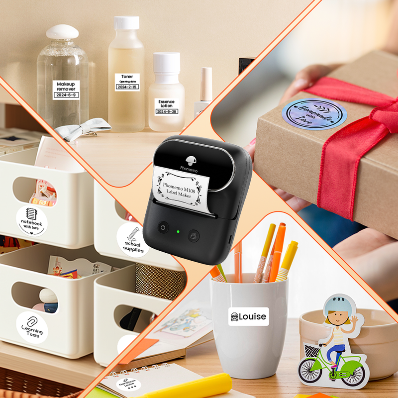 Compact and Portable Label Maker- Phomemo M108 label maker features a compact design, enabling easy portability. Its small size allows it to be carried conveniently, whether at home, in the office, or during travels. It serves as a practical tool for quick item labeling, suitable for various scenarios where on-the-go labeling is required
