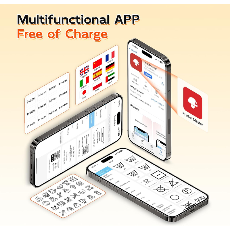 Connect phones/tablets via "Print Master" app (iOS/Android). Note: Pair through app only.