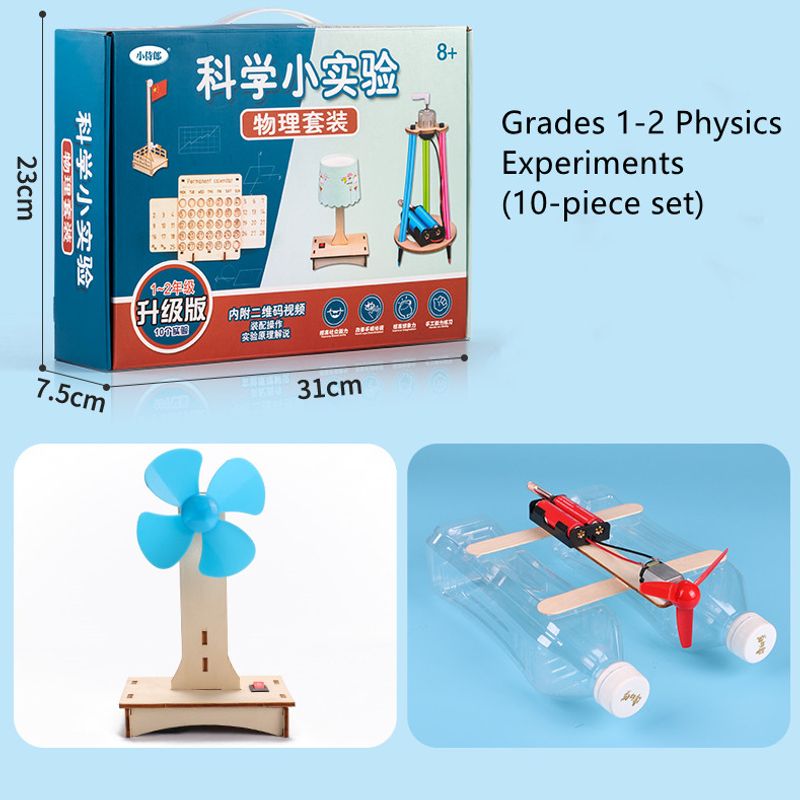 Grade 1-2 physics experiment (10-piece set) includes: electric fan, wind boat, climbing monkey, balance bird, small table lamp, flag lift, vacuum cleaner, basketball shooter, graffiti robot, perpetual calendar;