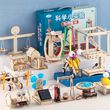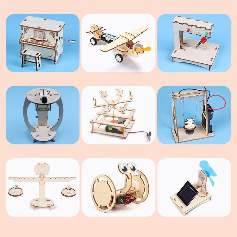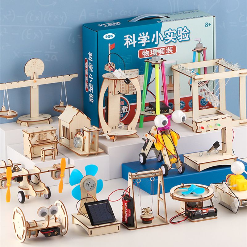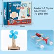 Grades 5-6 Physics Experiments (10-piece set) include: worm robot, new pendulum, mechanical pliers, excavator, tank car, paddle steamer, twin-prop plane, solar car, elevator lift, hand-cranked power station