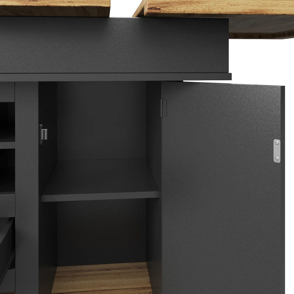 Smart storage: Height-adjustable shelves and magnetic soft-close cabinet doors with a stable base.
