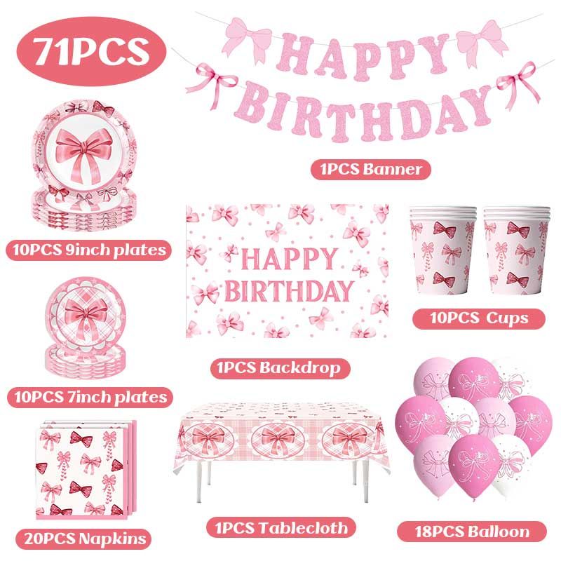 Pink Bow Birthday Decoration Tableware Plates Cups Napkin Tablecloth for Kids Girls Bow Themed Party Backdrop Banner Balloon Set