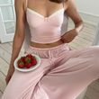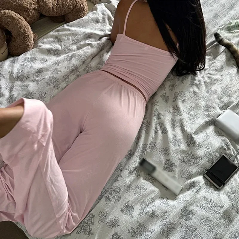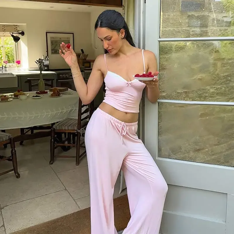 Pink Bow Straps Drawstring Pants V-neck Camisole Casual Soft and Comfortable Simple atmosphere Two-Piece Set Women's Clothing