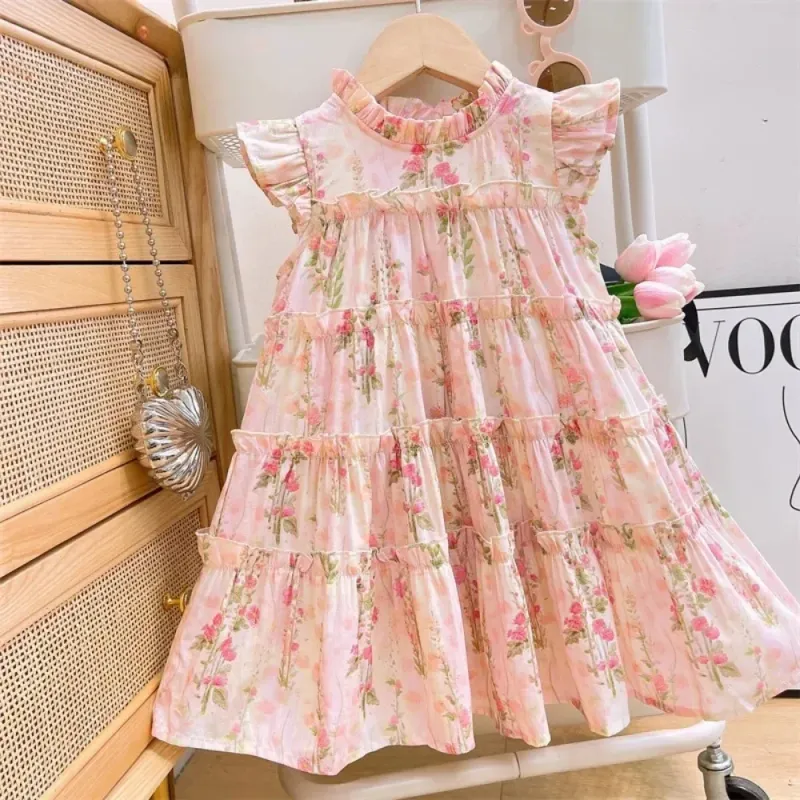 Pink Dreamy Sweet Girl Fairy Princess Dress Sleeveless Bow Decoration Mesh Lace Children's Casual Clothes Birthday Party Summer