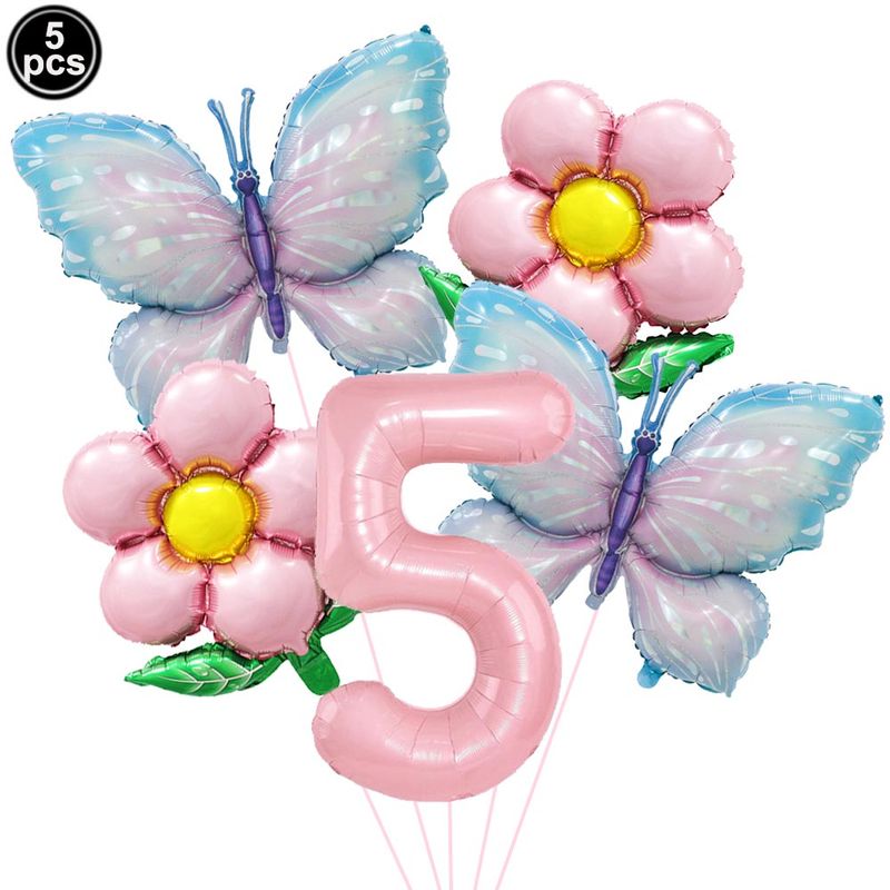 5pcs Pink Number Balloon Butterfly Balloon Set Butterfly Balloons Foil 32inch 1st-9th Number Birthday Decor for Girl Baby Shower